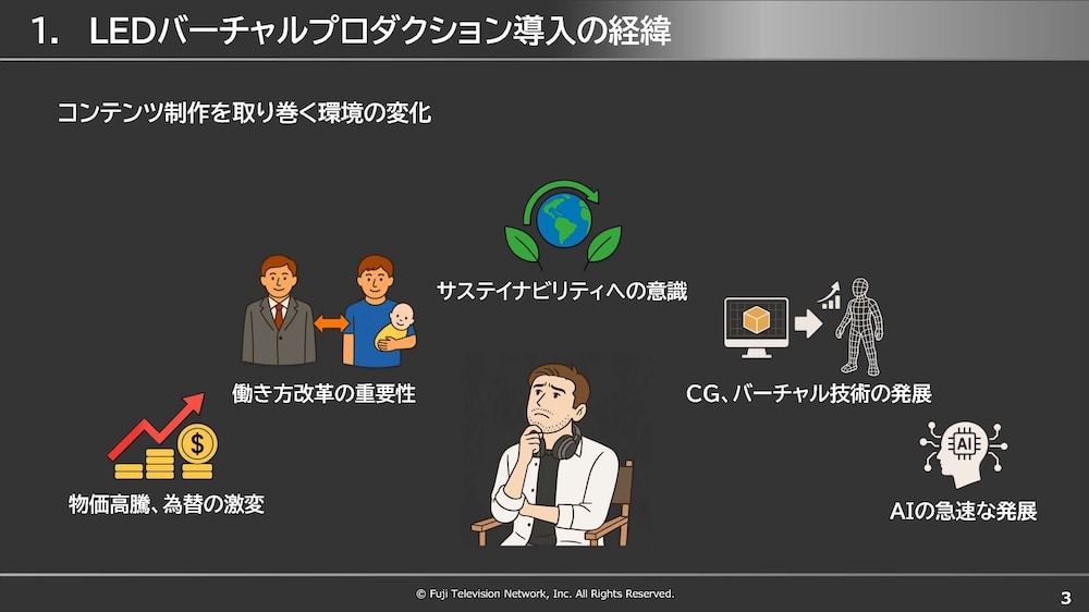 物価高の影響や働き方改革、サステナビリティなどに配慮した撮影の必要性を感じていた同社は、CG/バーチャル技術やAIの発展がVPスタジオ導入の後押しになったと説明しました。