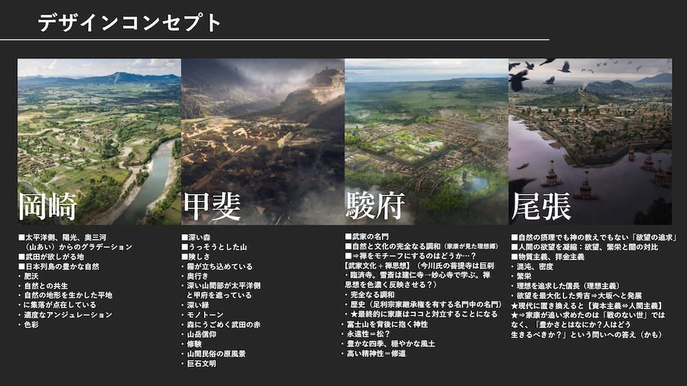 また、作中の代表的なロケーションである岡崎、甲斐、駿府、尾張をイメージしたデザインコンセプトを紹介し、各ロケーションをVPでどう再現したのか、背景アセットの特徴を踏まえながら解説しました。