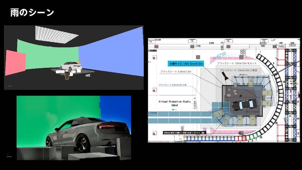 「VPを活用した走行シーンでは珍しい車線変更のシーンでは、カメラワークを想定しながら背景アセット撮影時も車線変更して撮影に臨んだ」、「雨のシーンはリアルロケとVP撮影のシーンをあえて交互に編集してみたものの、自分たちも違いが分からないものに仕上がった」など、VP撮影では難易度の高い数々のシーンをどうやってVPで実現させていったのか、クリエイティブと技術の融合による制作舞台裏を語りました。