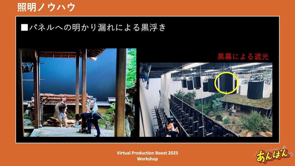 同局のテクニカルディレクターの久野裕大氏はVP撮影で必要不可欠な技術連携について説明。「色温度や照明設計を事前に共有するなど、リアルとアンリアルを馴染ませるためには、照明技師との連携が不可欠である」と述べ、キャストを待たせないための準備から影の処理まで現場での細やかな工夫を紹介しました。「あんぱん」の撮影ではLED特有の課題を克服するため、黒幕による遮光やLEDウォールとの適度な距離感などを考慮して事前準備されています。